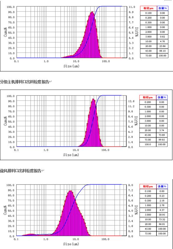 試驗(yàn)過程:30公斤金屬粉,經(jīng)過30分鐘分級后,三次取樣,兩次兩證參數(shù),達(dá)到粒度穩(wěn)定,同時(shí)測定設(shè)備處理量的試驗(yàn)效果。流動性指標(biāo)暫未提供。粒度分布如下圖: